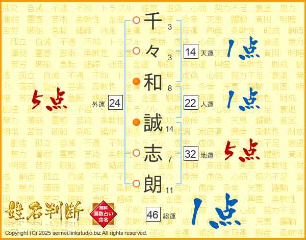千(3画)々(3画)和(8画) 誠(14画)志(7画)朗(11画)