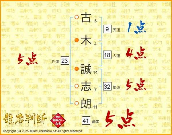 古(5画)木(4画) 誠(14画)志(7画)朗(11画)