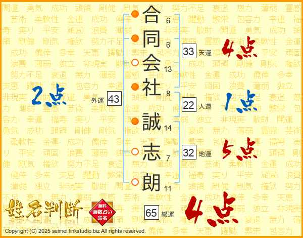 合(6画)同(6画)会(13画)社(8画) 誠(14画)志(7画)朗(11画)