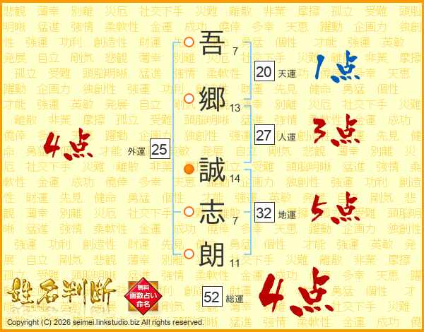 吾(7画)郷(13画) 誠(14画)志(7画)朗(11画)