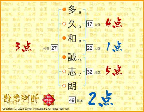 多(6画)久(3画)和(8画) 誠(14画)志(7画)朗(11画)