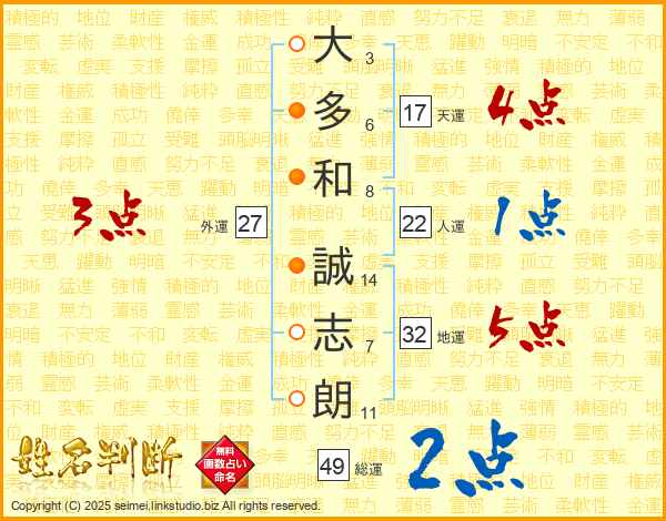 大(3画)多(6画)和(8画) 誠(14画)志(7画)朗(11画)