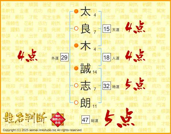 太(4画)良(7画)木(4画) 誠(14画)志(7画)朗(11画)
