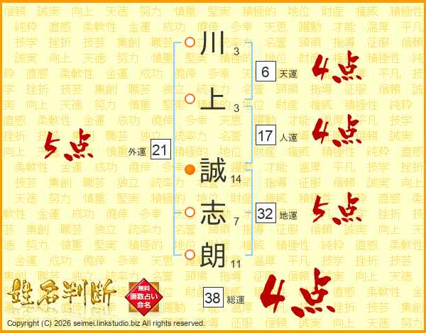 川(3画)上(3画) 誠(14画)志(7画)朗(11画)