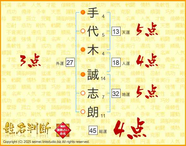 手(4画)代(5画)木(4画) 誠(14画)志(7画)朗(11画)