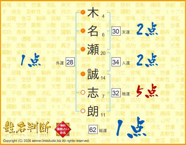 木(4画)名(6画)瀬(20画) 誠(14画)志(7画)朗(11画)