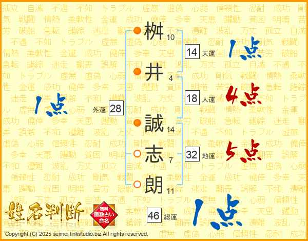 桝(10画)井(4画) 誠(14画)志(7画)朗(11画)