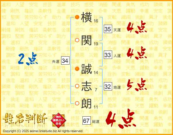 横(16画)関(19画) 誠(14画)志(7画)朗(11画)