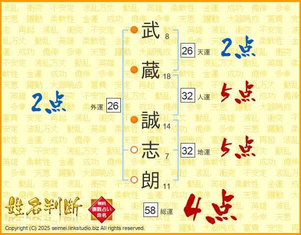 武(8画)蔵(18画) 誠(14画)志(7画)朗(11画)