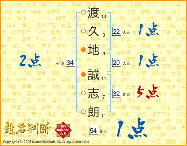 渡(13画)久(3画)地(6画) 誠(14画)志(7画)朗(11画)