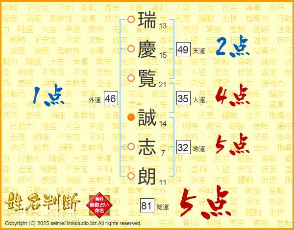 瑞(13画)慶(15画)覧(21画) 誠(14画)志(7画)朗(11画)