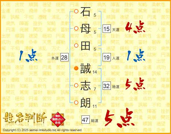 石(5画)母(5画)田(5画) 誠(14画)志(7画)朗(11画)