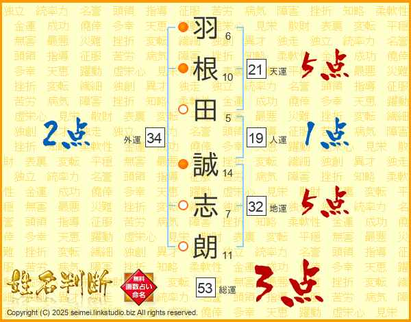羽根田誠志朗さんの天運は21画の5点!