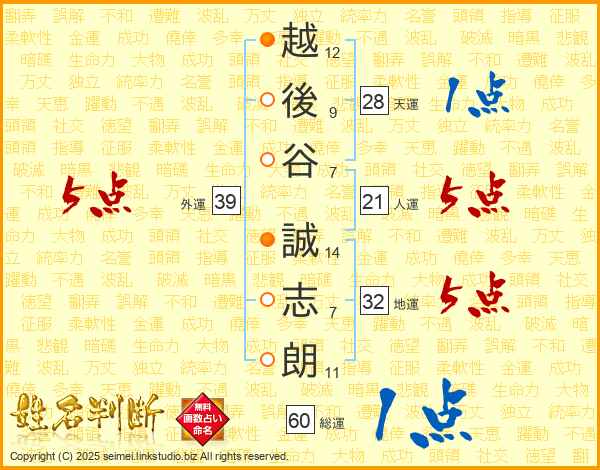 越後谷誠志朗さんの人運は21画の5点!