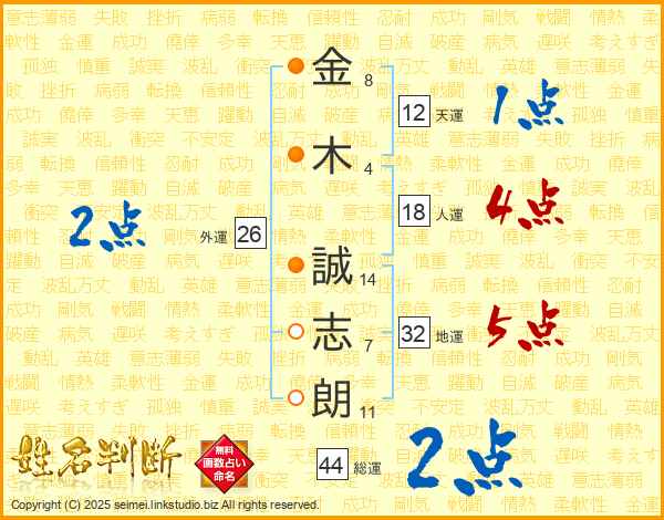 金(8画)木(4画) 誠(14画)志(7画)朗(11画)