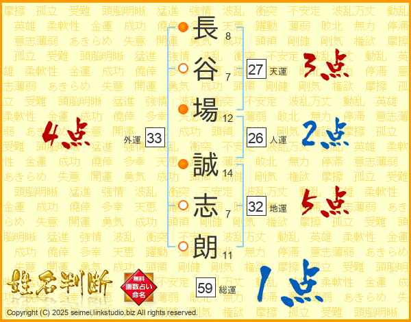 長(8画)谷(7画)場(12画) 誠(14画)志(7画)朗(11画)