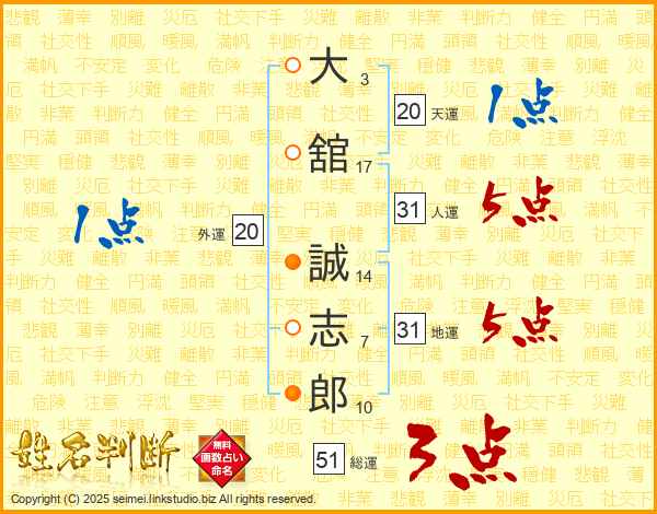 大(3画)舘(17画) 誠(14画)志(7画)郎(10画)