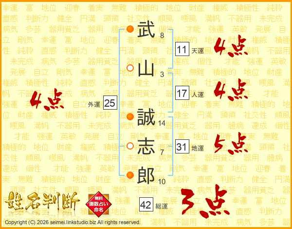 武(8画)山(3画) 誠(14画)志(7画)郎(10画)