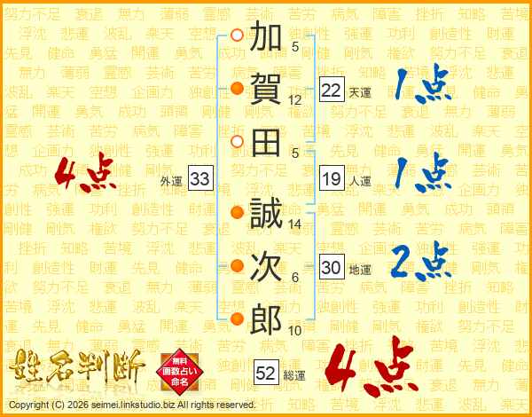 加(5画)賀(12画)田(5画) 誠(14画)次(6画)郎(10画)