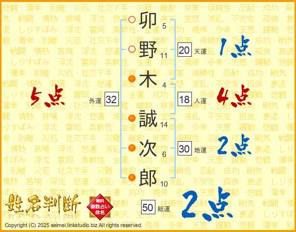 卯(5画)野(11画)木(4画) 誠(14画)次(6画)郎(10画)