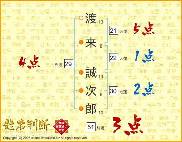 渡来誠次郎さんの天運は21画の5点!