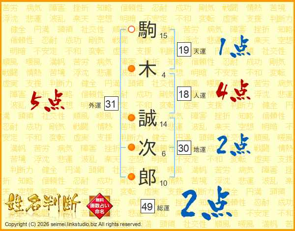 駒(15画)木(4画) 誠(14画)次(6画)郎(10画)