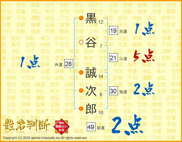 黒(12画)谷(7画) 誠(14画)次(6画)郎(10画)