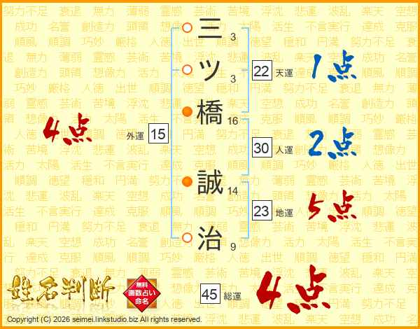 三ツ橋誠治さんの総運は45画の4点!