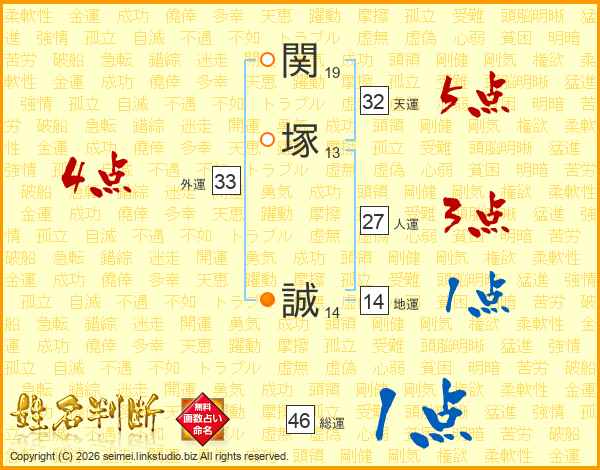 関(19画)塚(13画) 誠(14画)