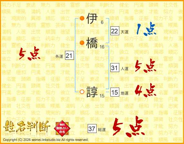 あなたの人生を表す1番重要な運勢です。生涯を通じて影響する総合運となり、主に50歳以降の晩年期に影響を及ぼします。苗字と名前の合計画数。