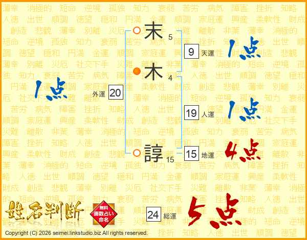 生活面を象徴する運勢です。外部から受ける影響力を表し、結婚運、家庭運や職場、環境への順応性を表します。総運から人運を引いた画数。姓や名が1文字の場合を除く。