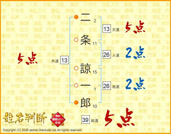 二条諒一郎さんの総運は39画の5点!
