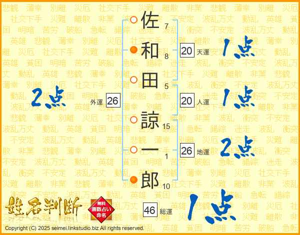 佐(7画)和(8画)田(5画) 諒(15画)一(1画)郎(10画)