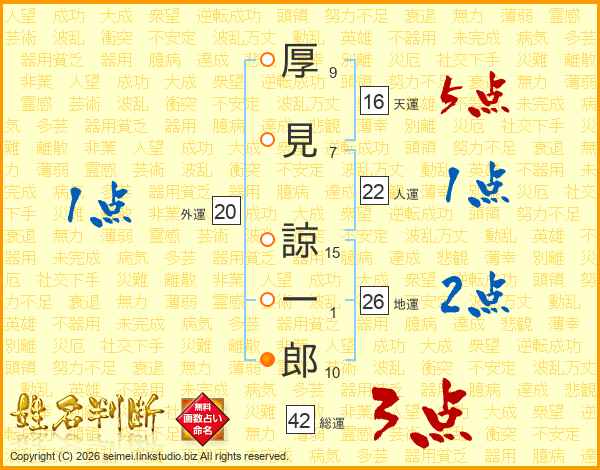 厚(9画)見(7画) 諒(15画)一(1画)郎(10画)