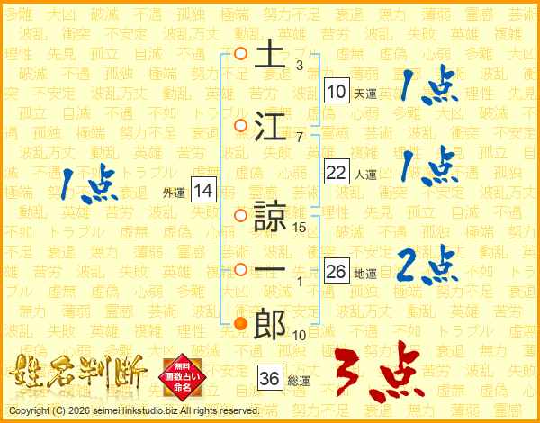 土(3画)江(7画) 諒(15画)一(1画)郎(10画)