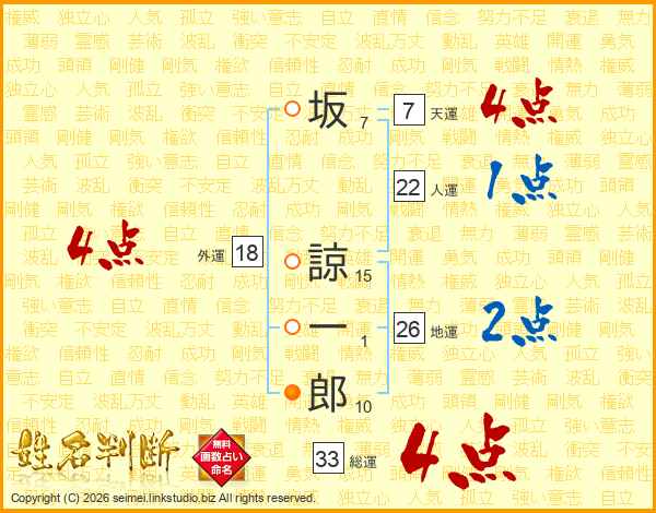 坂諒一郎さんの総運は33画の4点!