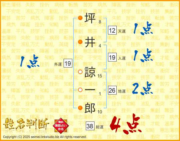 坪(8画)井(4画) 諒(15画)一(1画)郎(10画)
