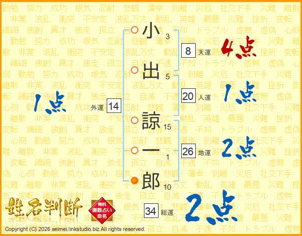 小(3画)出(5画) 諒(15画)一(1画)郎(10画)