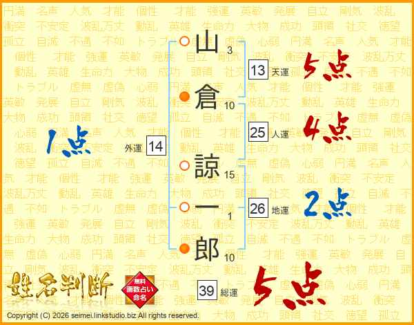 山倉諒一郎さんの総運は39画の5点!