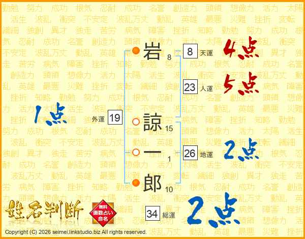 岩(8画) 諒(15画)一(1画)郎(10画)