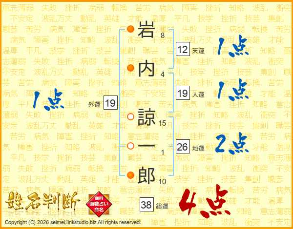 岩(8画)内(4画) 諒(15画)一(1画)郎(10画)