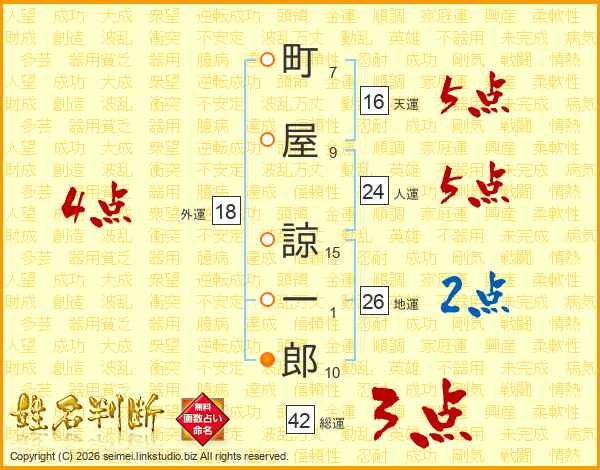 町(7画)屋(9画) 諒(15画)一(1画)郎(10画)