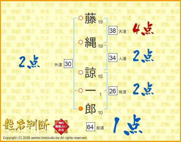 藤(19画)縄(19画) 諒(15画)一(1画)郎(10画)