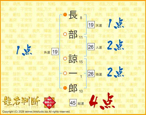 長(8画)部(11画) 諒(15画)一(1画)郎(10画)