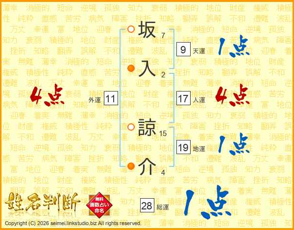 坂(7画)入(2画) 諒(15画)介(4画)