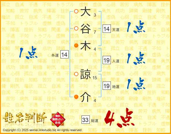 大(3画)谷(7画)木(4画) 諒(15画)介(4画)