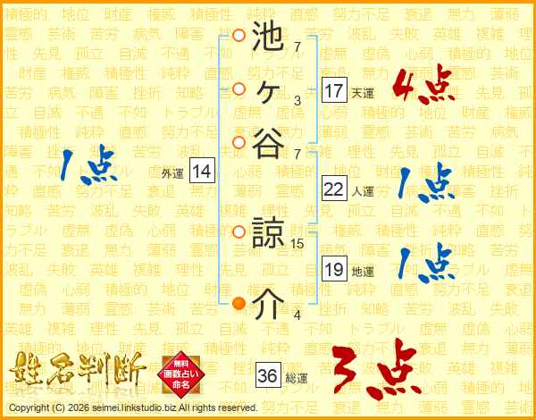 池(7画)ヶ(3画)谷(7画) 諒(15画)介(4画)