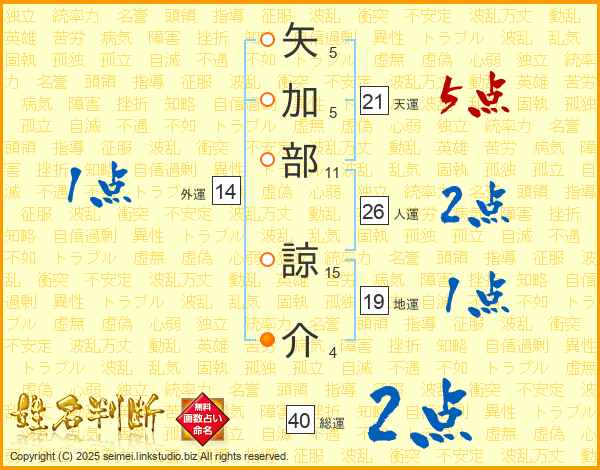 矢(5画)加(5画)部(11画) 諒(15画)介(4画)