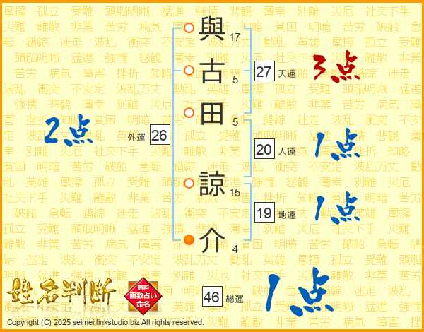 與(17画)古(5画)田(5画) 諒(15画)介(4画)