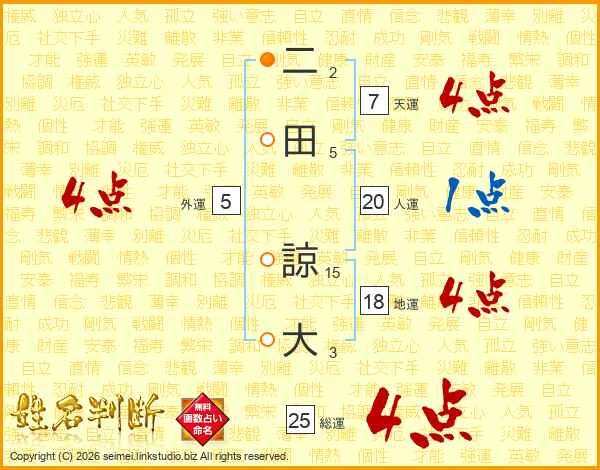 生活面を象徴する運勢です。外部から受ける影響力を表し、結婚運、家庭運や職場、環境への順応性を表します。総運から人運を引いた画数。姓や名が1文字の場合を除く。